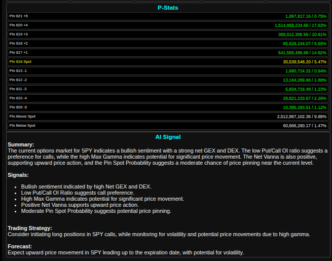 Metric Value Strike Net GEX +$250 K γ $616 Net DEX +$340 K Δ $616 Max Gamma Strike $610 Peak γ Max λ-GEX Strike $620 Peak λγ Flip Strike $617 Γ sign change